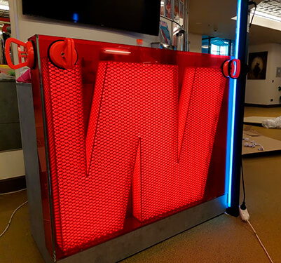 Изготовление световой буквы для сети фитнес "WorldClass". Буква состоит из внешней части - псевдо решетки и внутренней световой буквы.