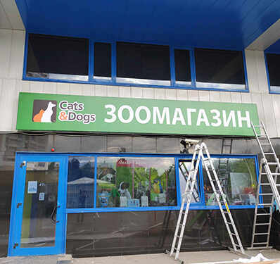 Реставрация баннерного светового короба сети зоомагазина "Cat's&Dog's". Работы по изготовлению и монтажу внутренней навигации в ТЦ.